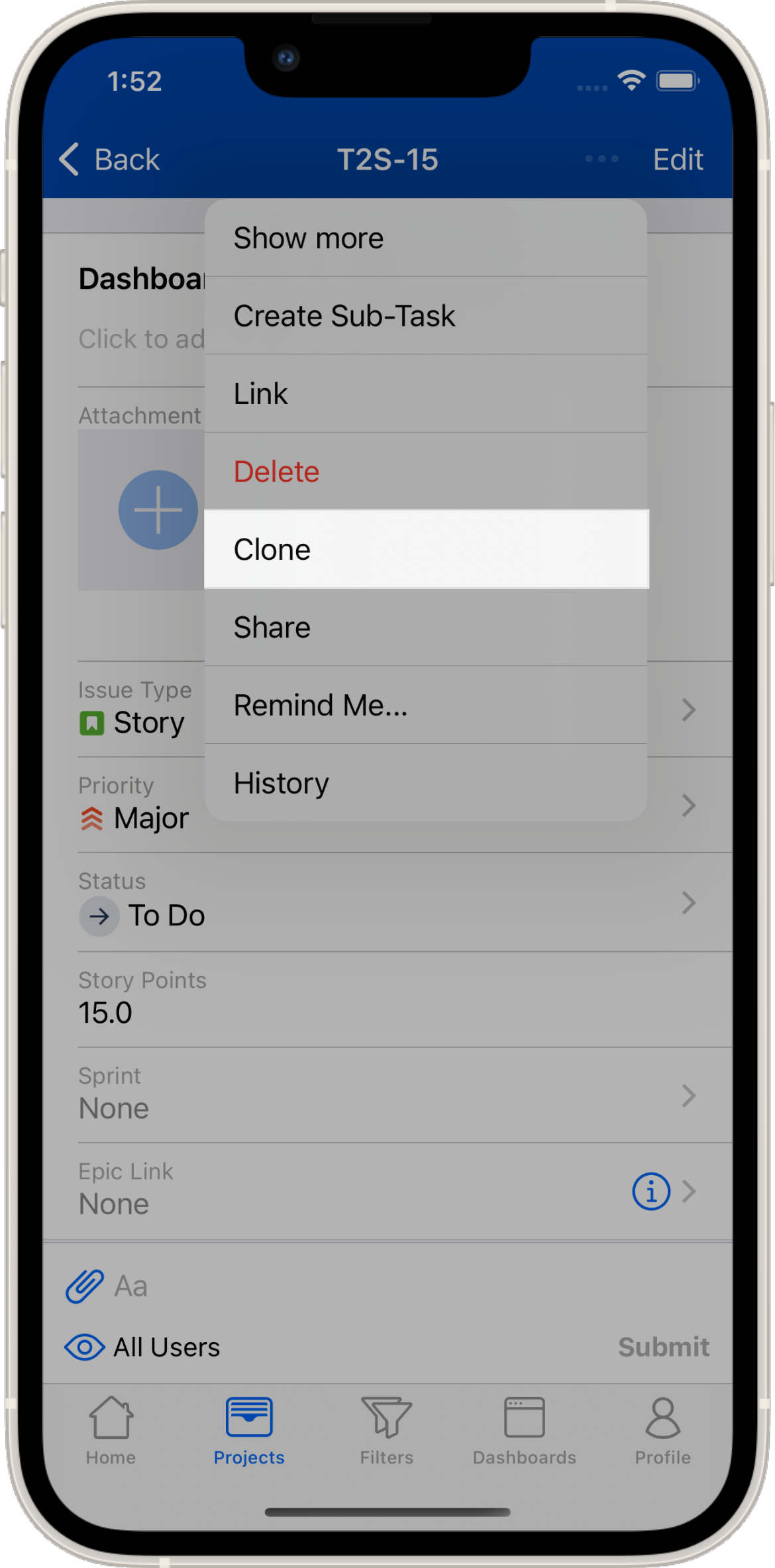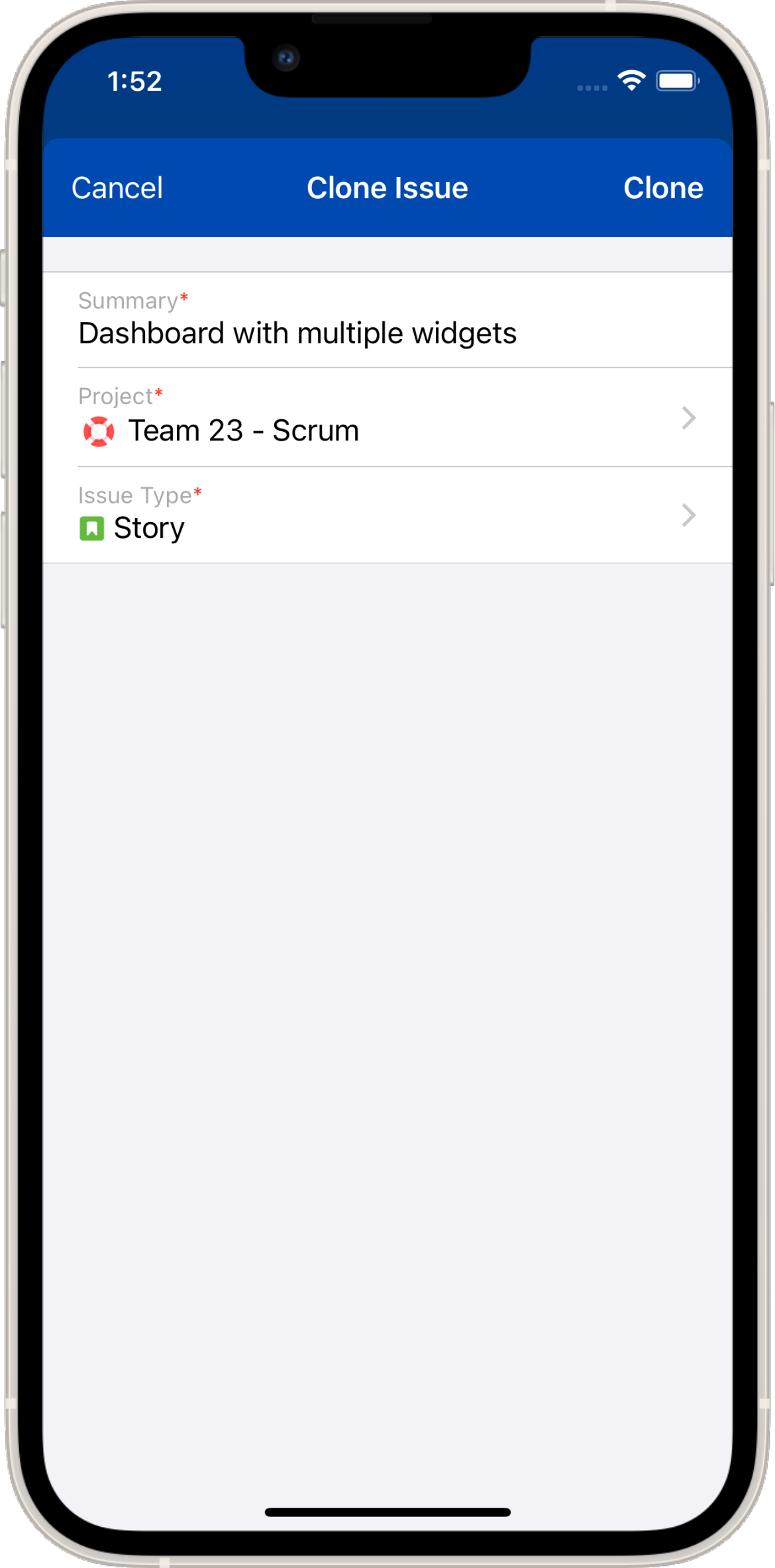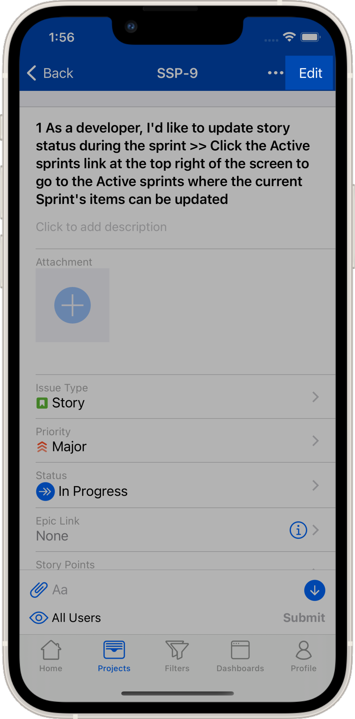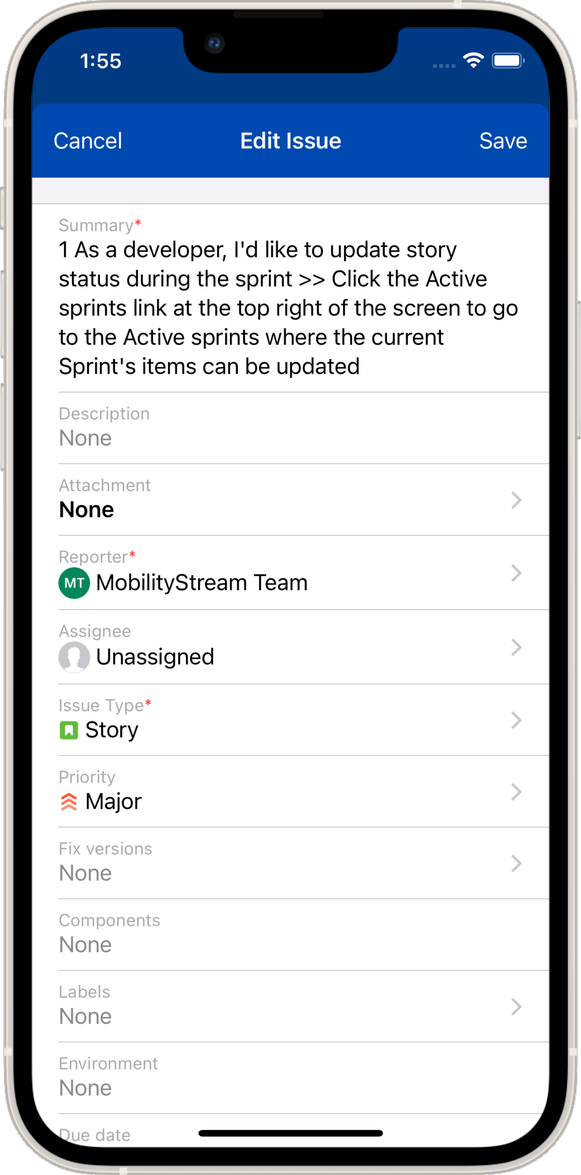 Tap on any issue on an issue list or board and its detail view will come up. Fields can be edited by