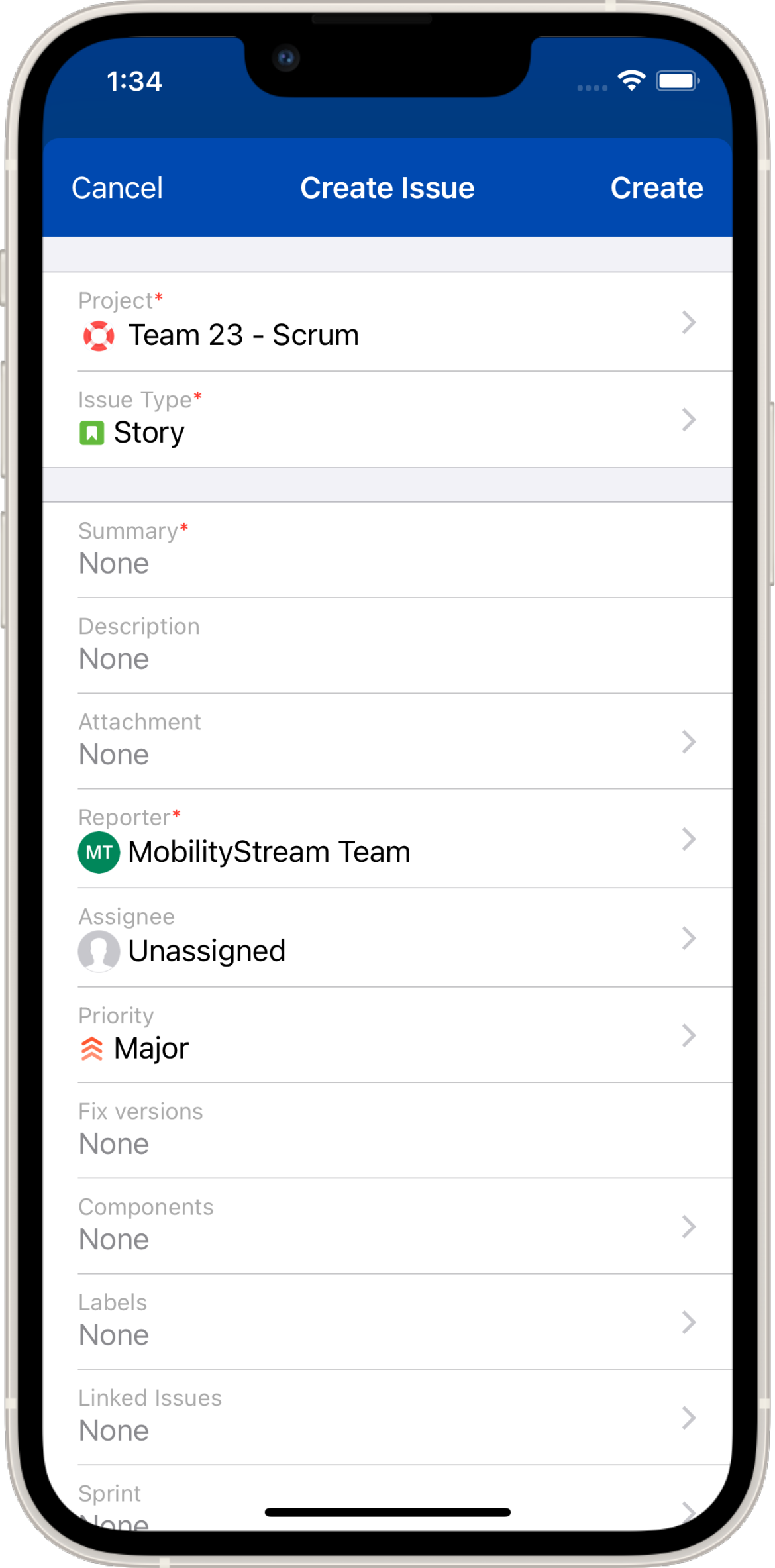 After that the correct form for the selected issue type will be displayed and can be filled out. All required fields are marked with a red asterisk *. When you are done, press the Create button on the top right. The issue will be created and displayed on the screen.