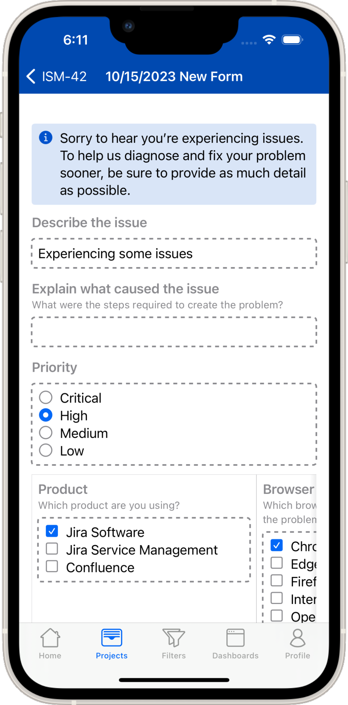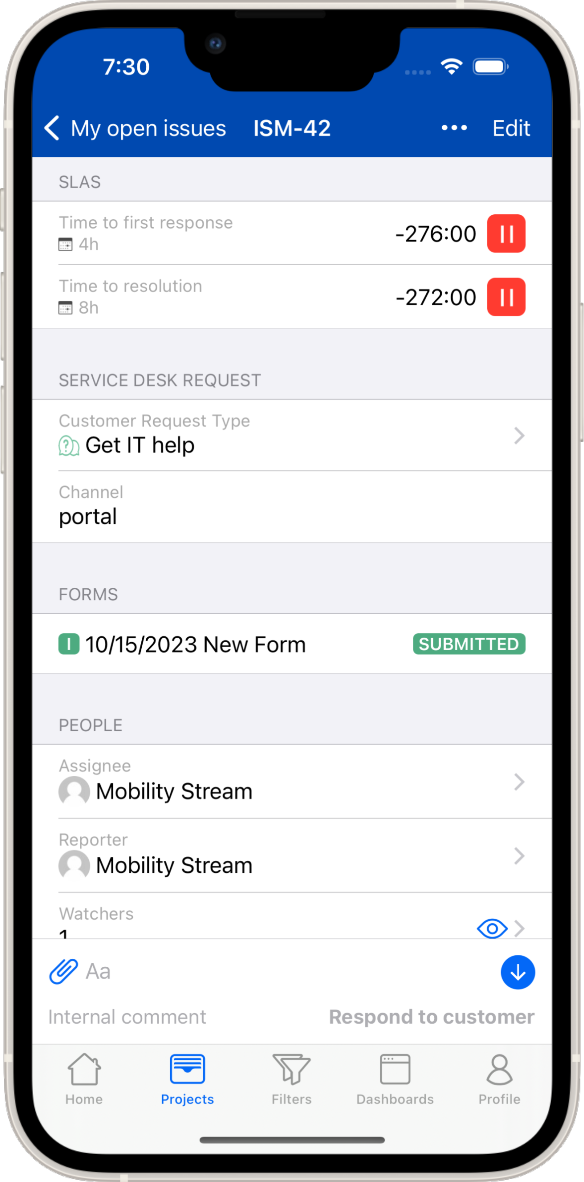 If you are using Forms (previously ProForma) in Jira, you can easily add, view, and edit them in Mobility for Jira. To view a form, pick an issue that has a form attached and scroll to the Forms Section. Each attached form is listed with its name and current status. You will be able to display the form by tapping on the form entry. When pressing edit the form becomes editable. Also you have several other options to make the form internal/external, view it as PDF or XLSX.