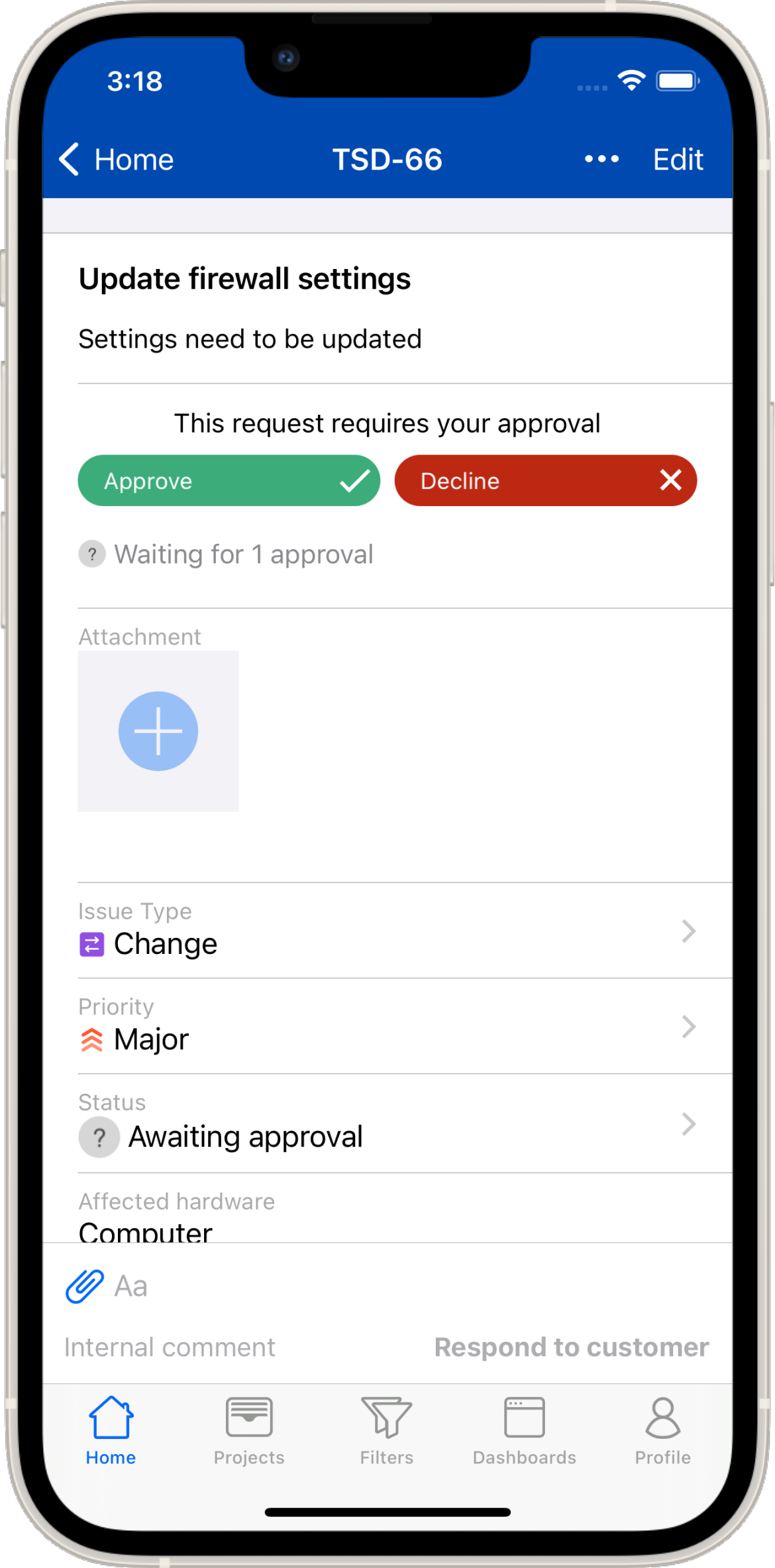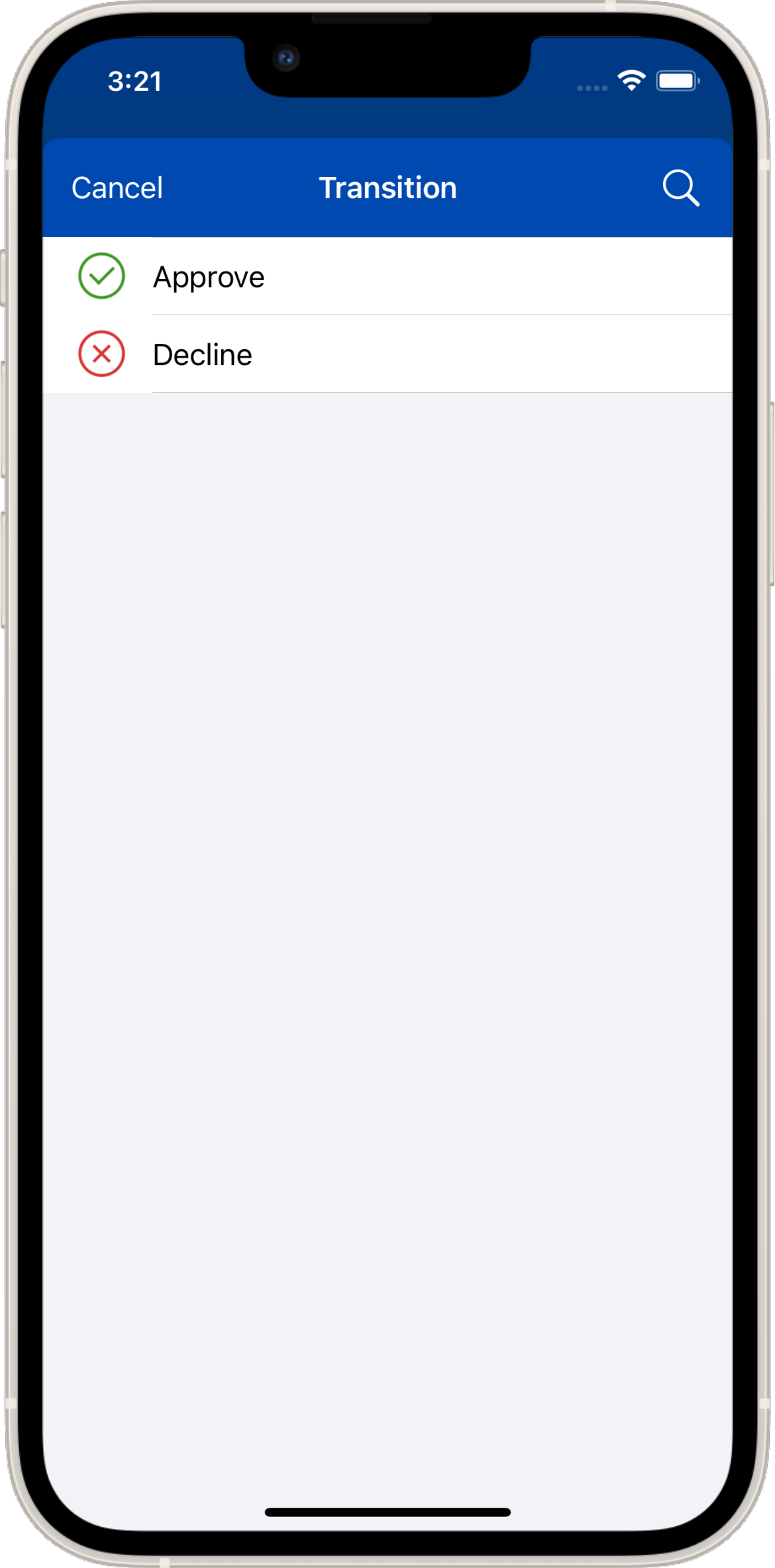 Alternatively, you can tap the Status field, which will open up the Transition screen as usual, then select Approve or Decline.
