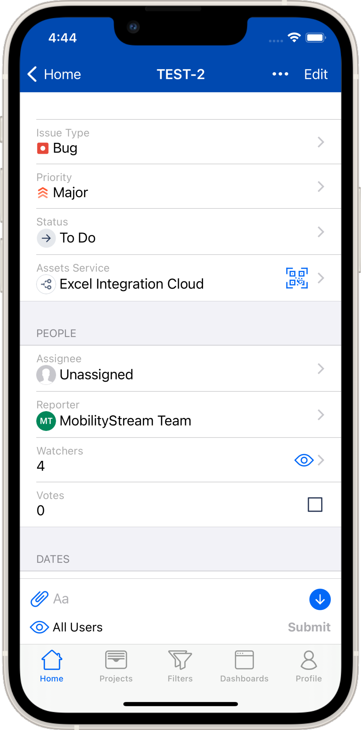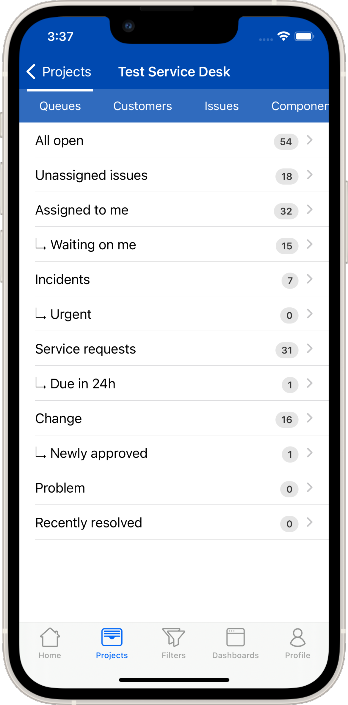 Queues are displayed as defined in the Jira web version. If you would like to add an additional queue, this needs to be done in the Jira web version but will show up immediately in Mobility for Jira. Since Mobility for Jira caches some of the data, the queue view may need to be pulled down to be refreshed. Each Queue shows the number of Jira issues it includes. Tapping a queue displays a issue list.