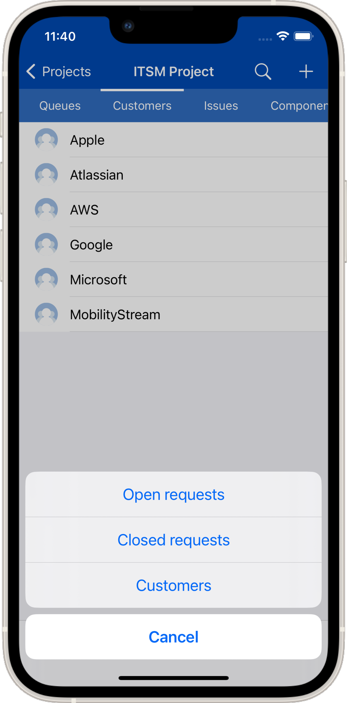 On mobile customers and organizations are displayed. Associated open and closed requests as well as customers/users can be viewed.