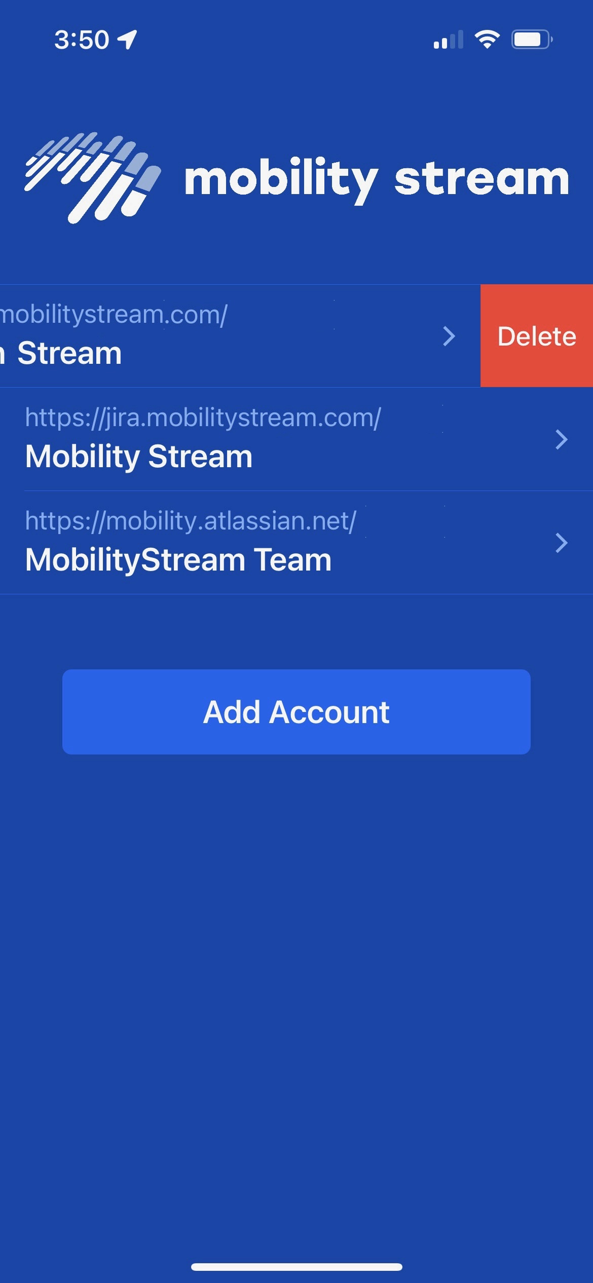 On the account page you can add and remove accounts. To remove accounts, left swipe the account name and then tap delete. New accounts can be added by tapping the Add Account button. To get to the account page when your account is set to log in automatically, you can simply go to the Profile area and the log out of the application. After that you will get to the Account page.