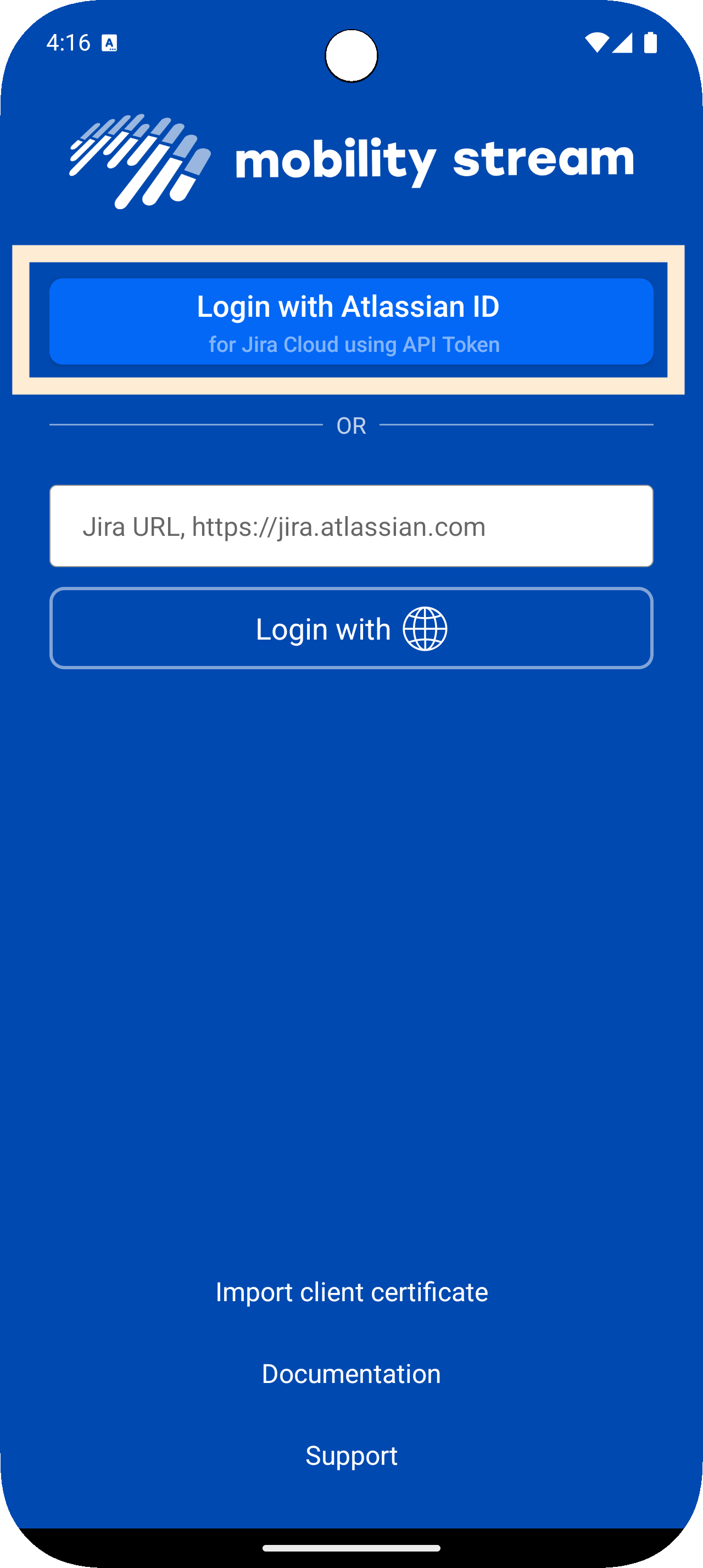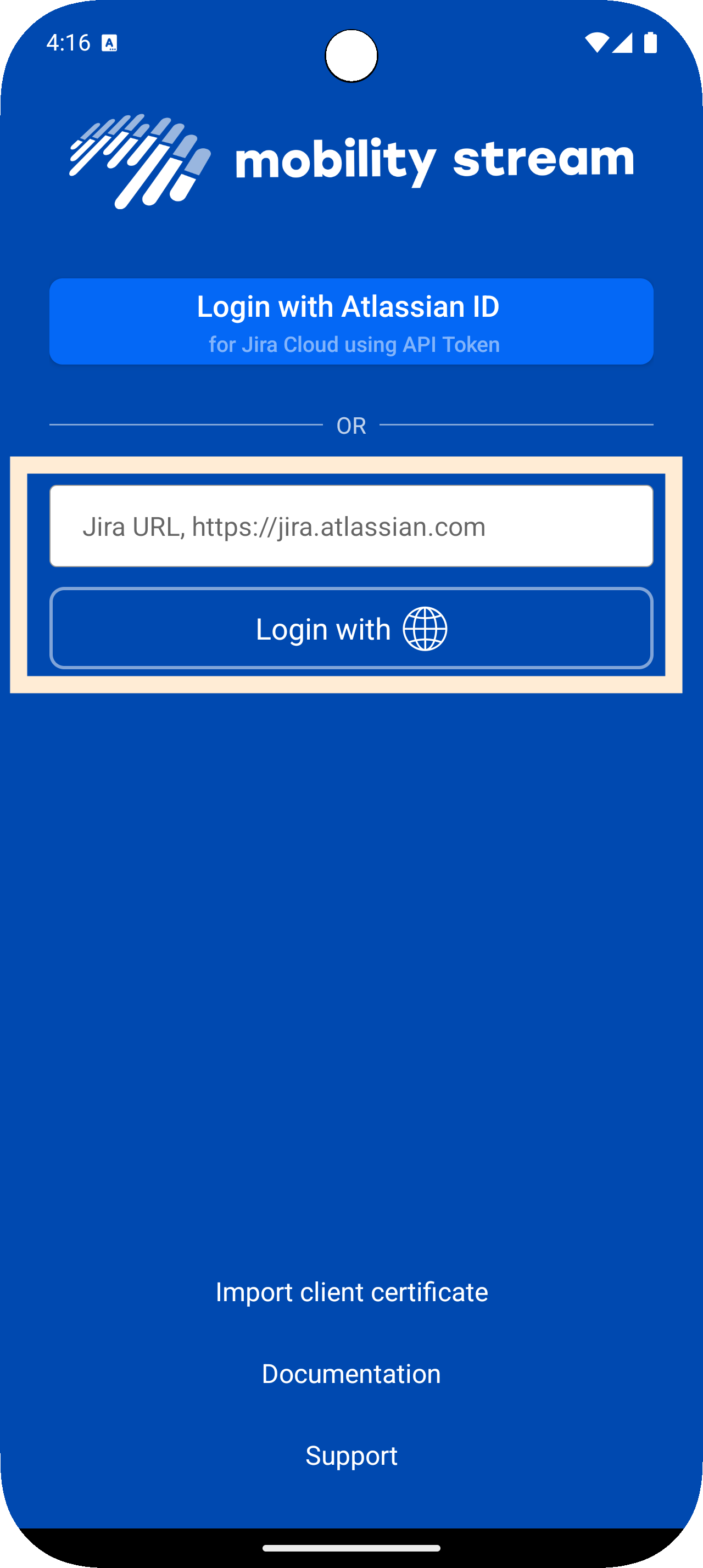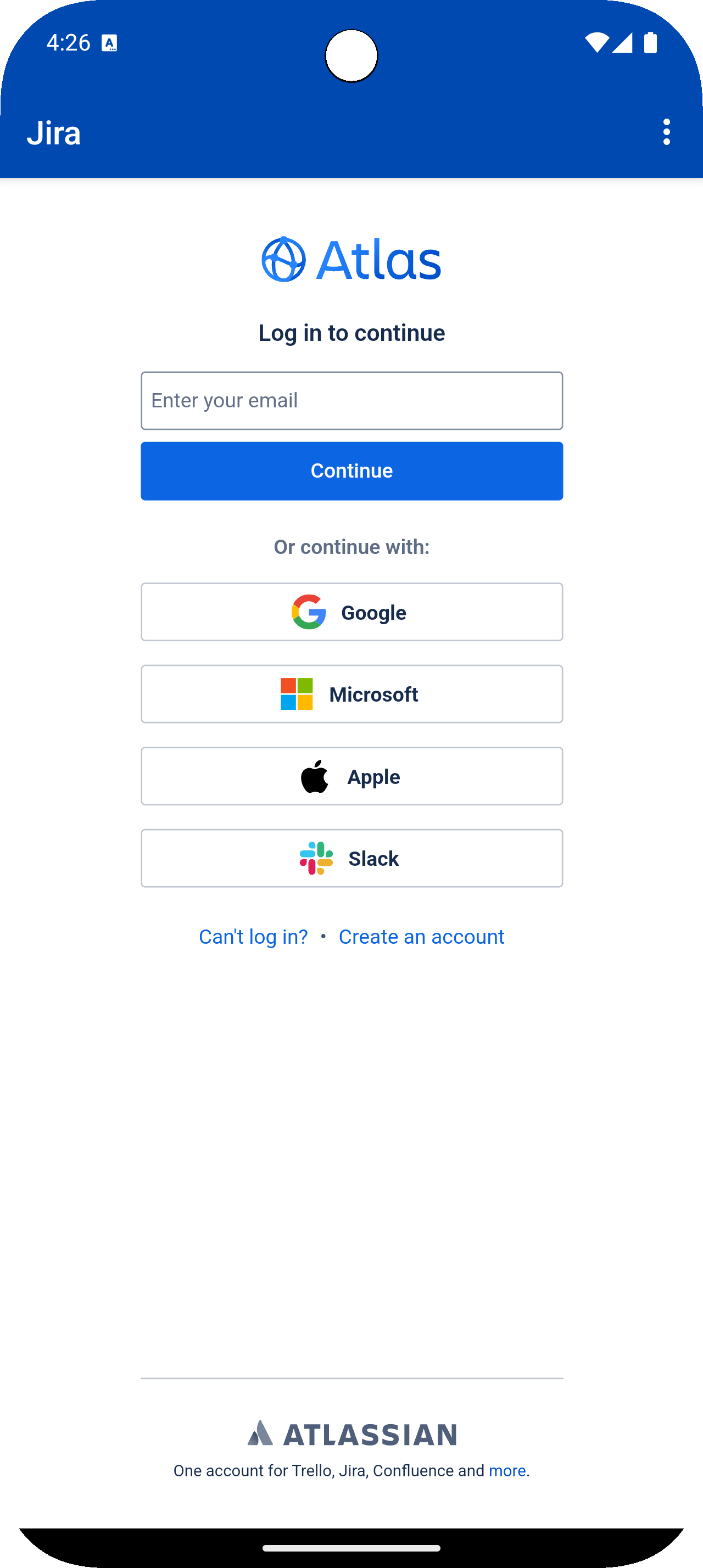 The app displays Jira login screen in a web view. Enter your credentials and then press login. After successful authentication with your Identity Provider, the app will log you in. This is also the default login for Jira Cloud. You will be directed to this automatically when typing in a Jira Cloud address.