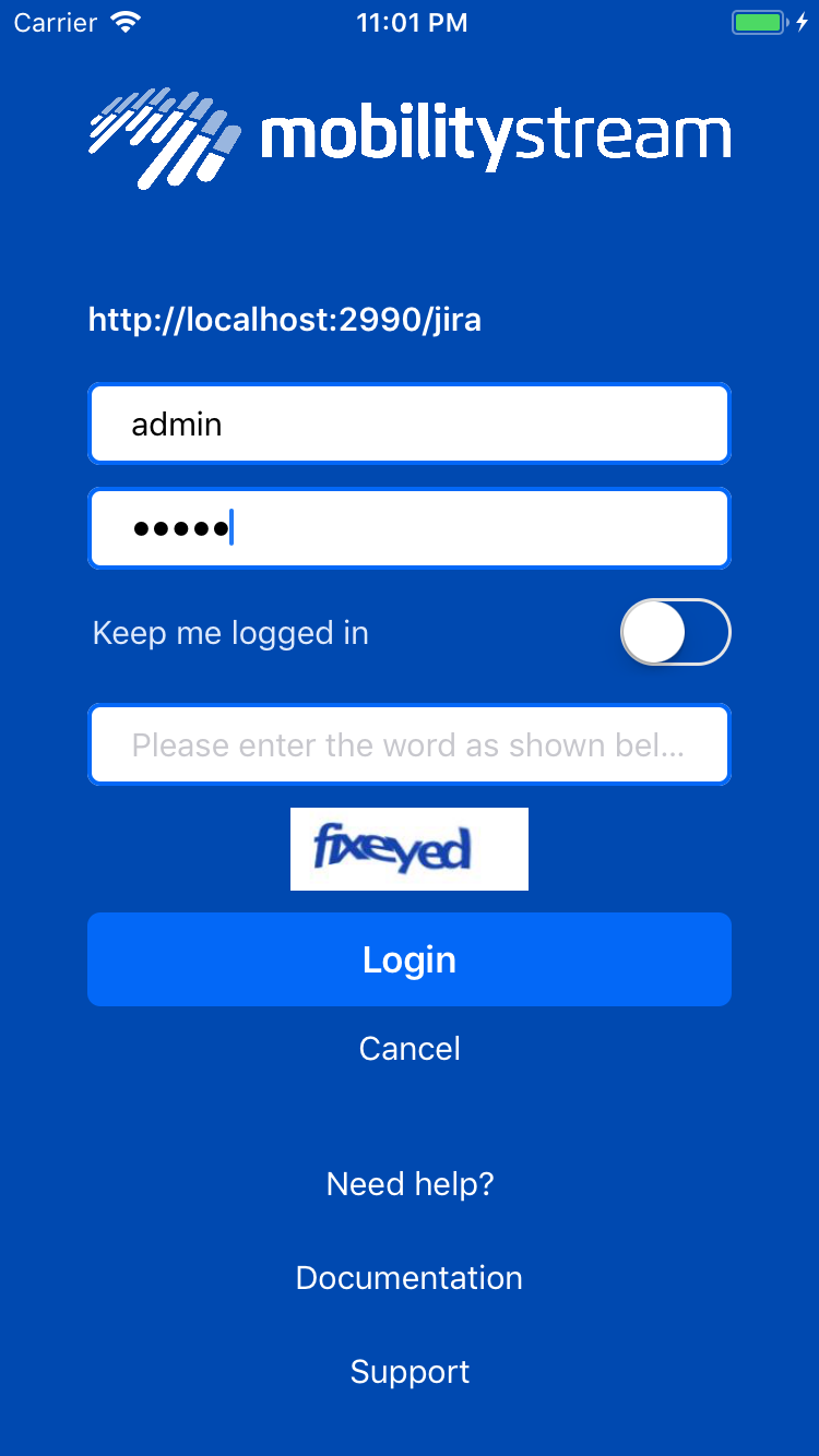 When the username/password combination was enter wrong a few times in a row, Mobility for Jira may display a CAPTCHA that needs to be solved. It is important to not only correctly type the displayed word but also to correct the wrong username/password. If you like to refresh the CAPTCHA and get a new image, simply hit the Login button. The CAPTCHA is produced by Jira itself, the Mobility for Jira app has no control over it.
