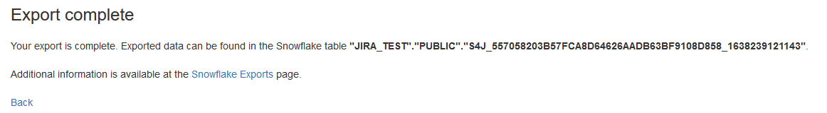 When your export is complete, you will be presented with a screen showing the location of your export and linking you to additional information on the Snowflake Exports screen.