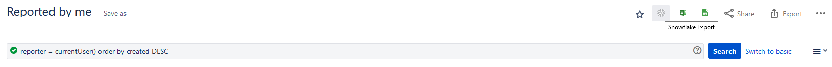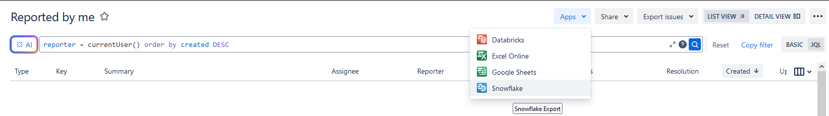 Note: If you cannot find the Snowflake Export action icon at the top right of the Issue Navigator screen, you may be using a newer Issue Navigator view. Check for the Snowflake item in the Apps dropdown, if present: