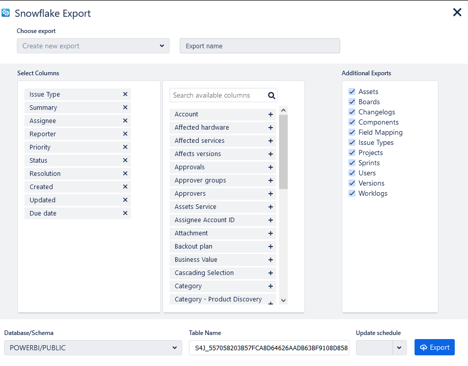 Select the standard and custom fields that you want to export, provide an export name, select an optional update schedule, choose any additional exports you'd like to include, an optional database, schema, and export table name, and click the Export button.
