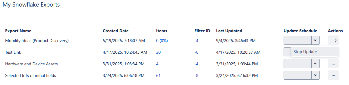 From the My Snowflake Exports screen, Jira users can perform the following actions on the exports:
