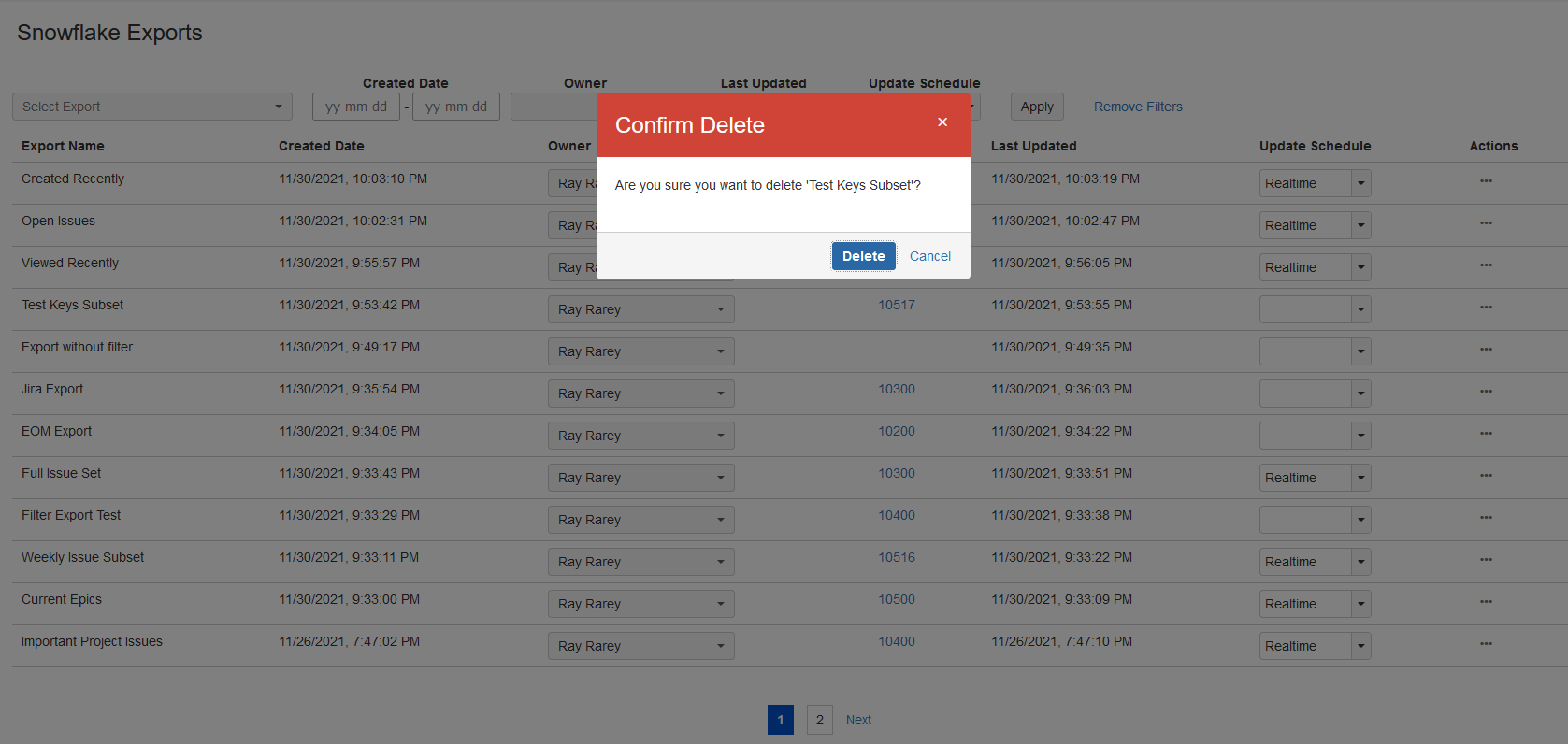 The Snowflake Exports screen allows a Jira administrator to easily delete an export. Simply click the Actions button for the export you wish to remove, then choose Delete from the Actions menu, and confirm your request.