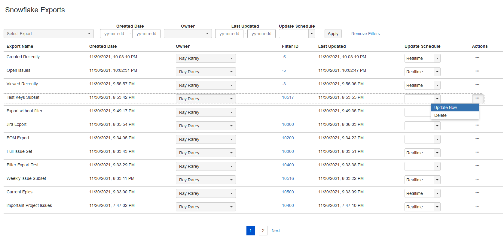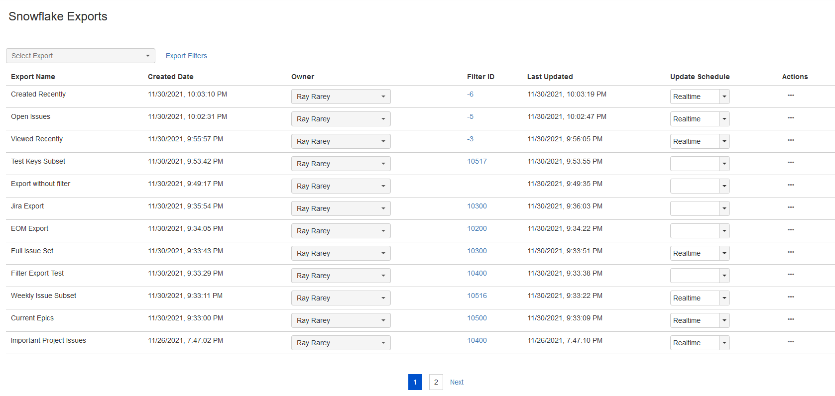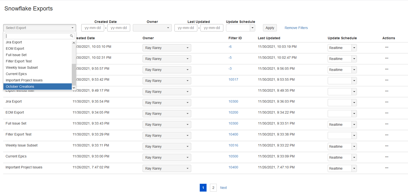 To change an export's Jira owner from the Snowflake Exports screen, click on the owner drop down and choose a new owner from the user picker. Changes to export owners take effect immediately. This controls which user can see the export on the Export screen in the Update Existing Export drop down.