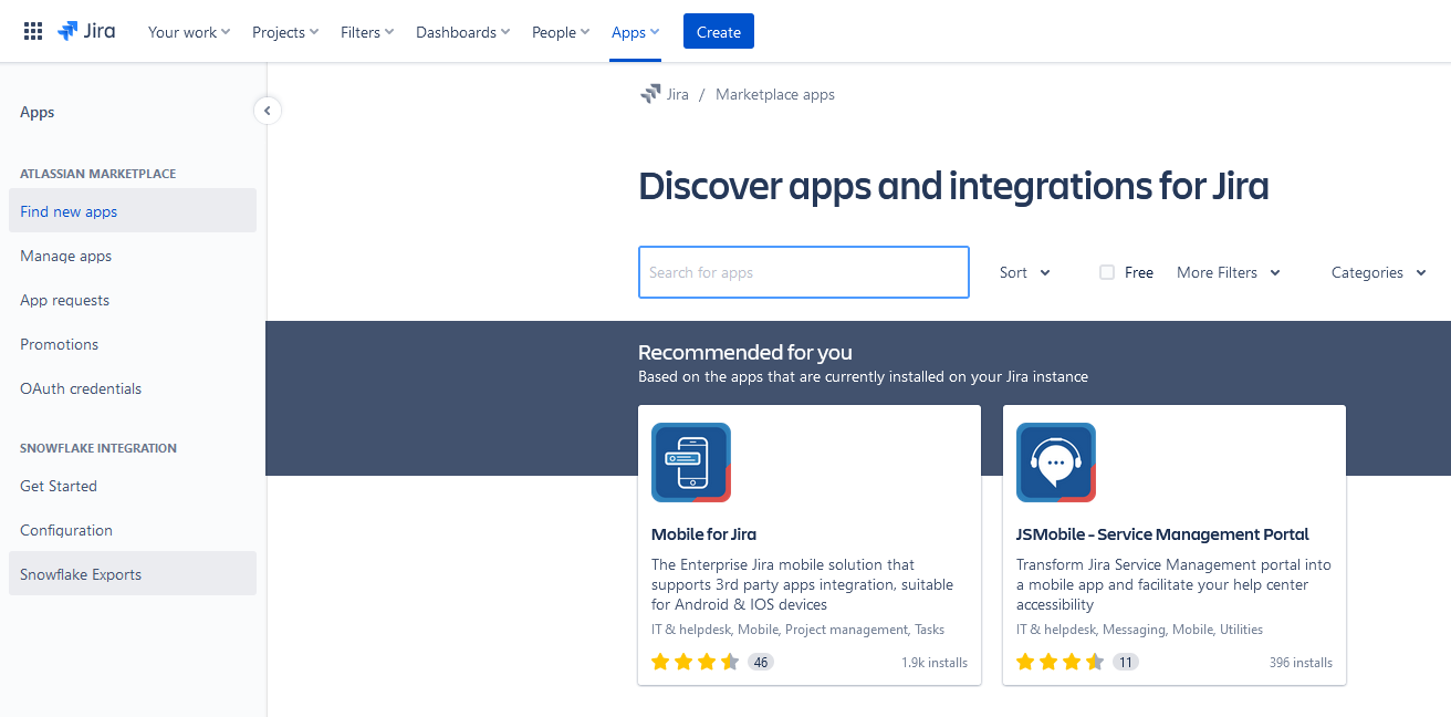 To access the Snowflake Exports screen, navigate to the Jira apps administration section in your Jira instance, and on the left side you will find the Snowflake Exports link under a Snowflake Integration heading.
