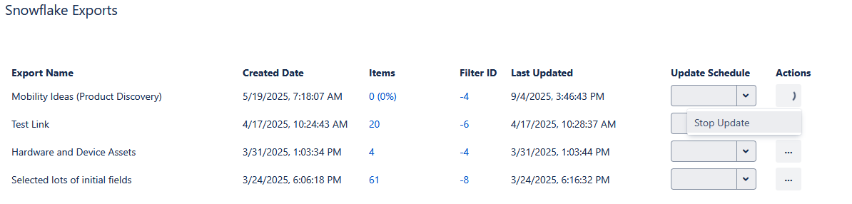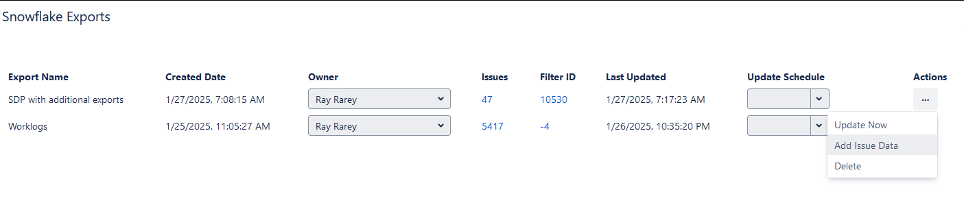 From the Snowflake Exports screen, Jira administrators can perform the following actions on the exports: